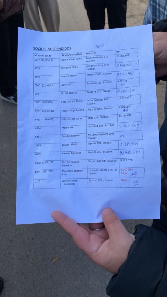 Según relataron los propios socios, al llegar al lugar se encontraron con una nómina exhibida en la puerta que incluía a al menos 20 afiliados suspendidos, sin que se presentaran las actas correspondientes de la comisión directiva, ni las causales de suspensión establecidas por el estatuto. Tampoco habrían recibido notificación formal alguna.