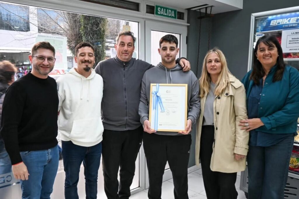 La distinción fue entregada por el diputado provincial Leo Moreno, junto a Chmit y la concejal Laura Cejas, al actual propietario de la carnicería.